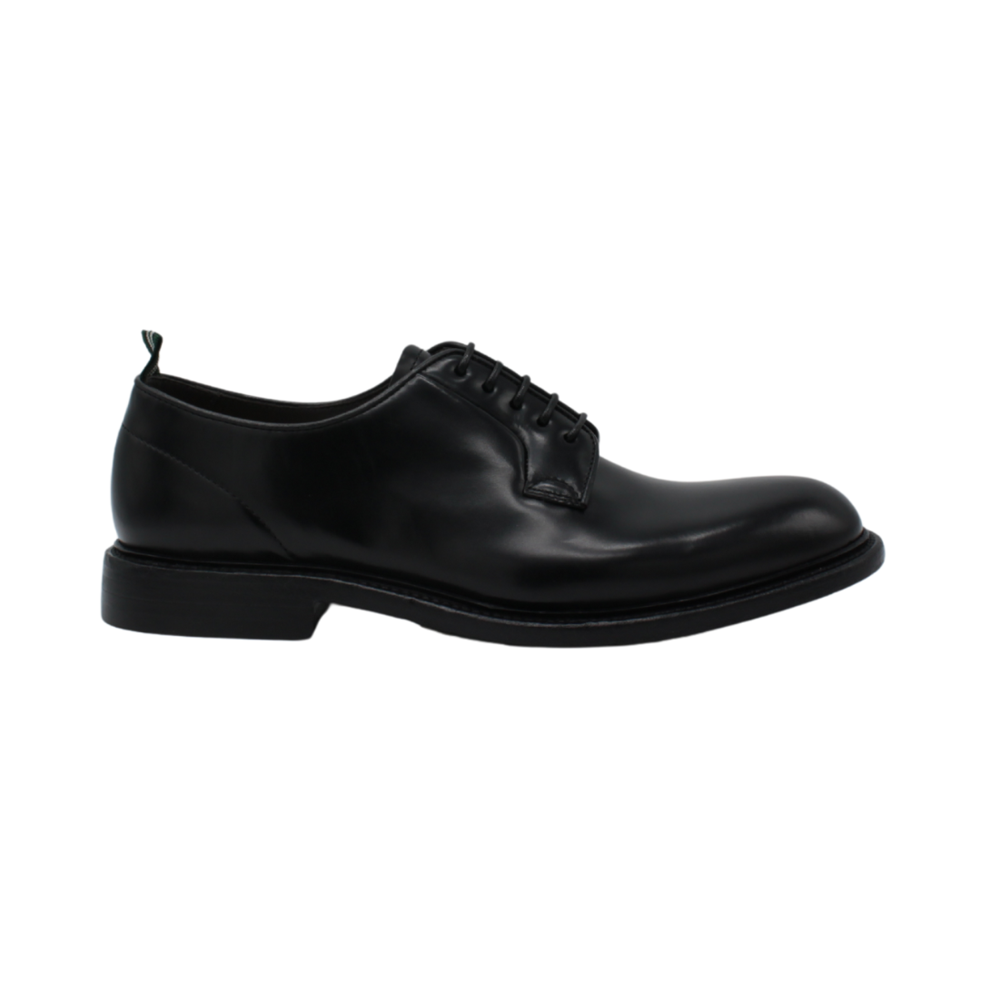 Derby in pelle spazzolata effetto lucido. Allacciatura con 5 asole taglio vivo e lacci in tinta. Fodera in pelle. Sottopiede logato in cuoio. Tirantino posteriore sporty che agevola la calzata. Fondo in vero cuoio. Tacco alto 20mm. Artigianale made in Italy.