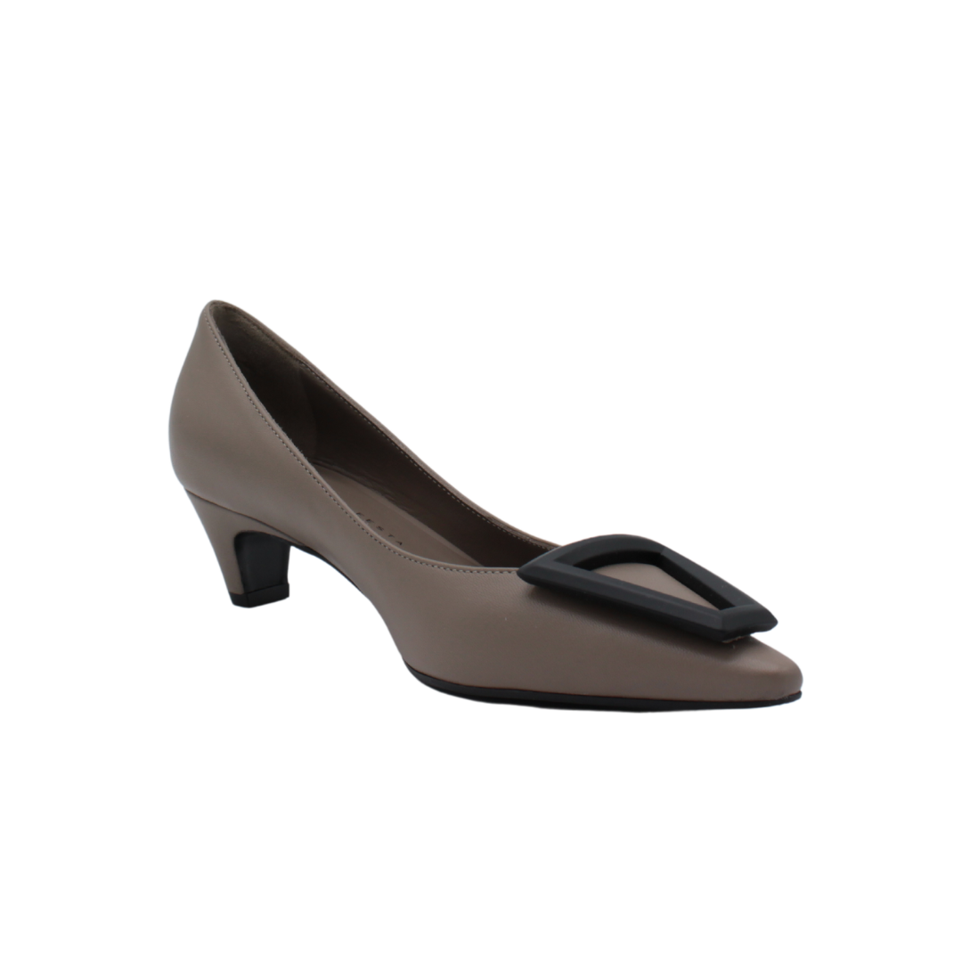 Décolleté dal tacco da 40 mm, caratterizzate da una silhouette elegante e contemporanea, realizzate in pelle di agnello color asfalto. Il dettaglio della fibbia sullo scollo del piede in nero opaco gommato aggiunge un tocco di raffinatezza. Perfette per un look sofisticato e senza tempo.